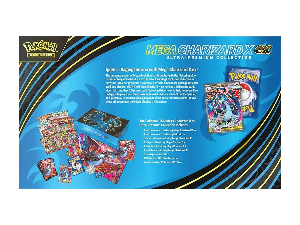 Pokémon TCG: Mega Evolution Mega Charizard X ex Ultra Premium Collection bol vydaný 14. novembra 2025 a obsahuje: