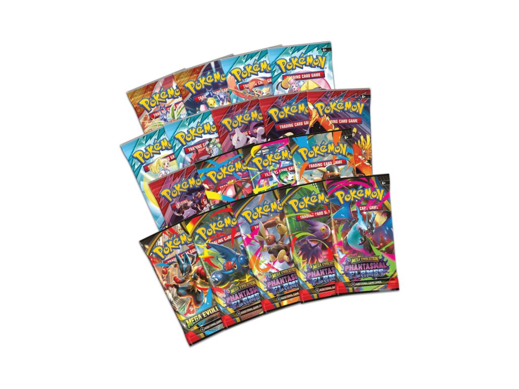 18x booster (4x Phantasmal Flames, 4x Mega Evolution, 4x Destined Rivals, 4x Journey Together, 2x Surging Sparks)