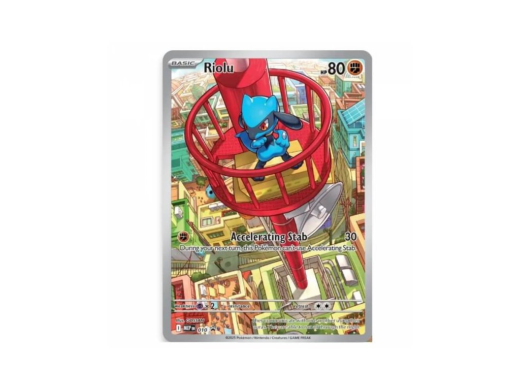 Pokémon TCG: Mega Evolution 1.0 - Base set Elite Trainer Box - Lucario obsahuje 9x booster, 1x promo karta Pokémona Riolu a zvyšok príslušenstva ETB.